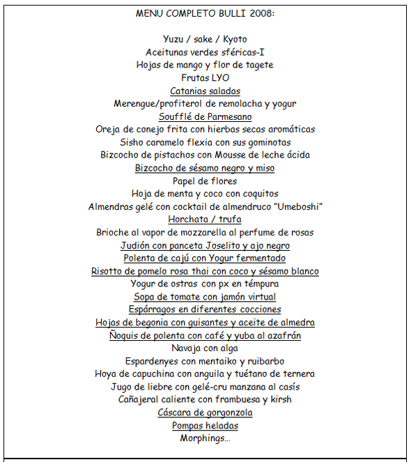 Tras seis meses de trabajos e investigaciones en su taller de Barcelona, llegó la hora de plasmar sobre el plato las últimas propuestas del intrépido Adrià. El resultado, un menú excepcional lleno de creaciones brillantes, que demuestran una vez más que la cocina es todavía una fuente inagotable de sorpresas y que Ferran Adrià continúa aportando arte y saber hacer al escenario gastronómico mundial.